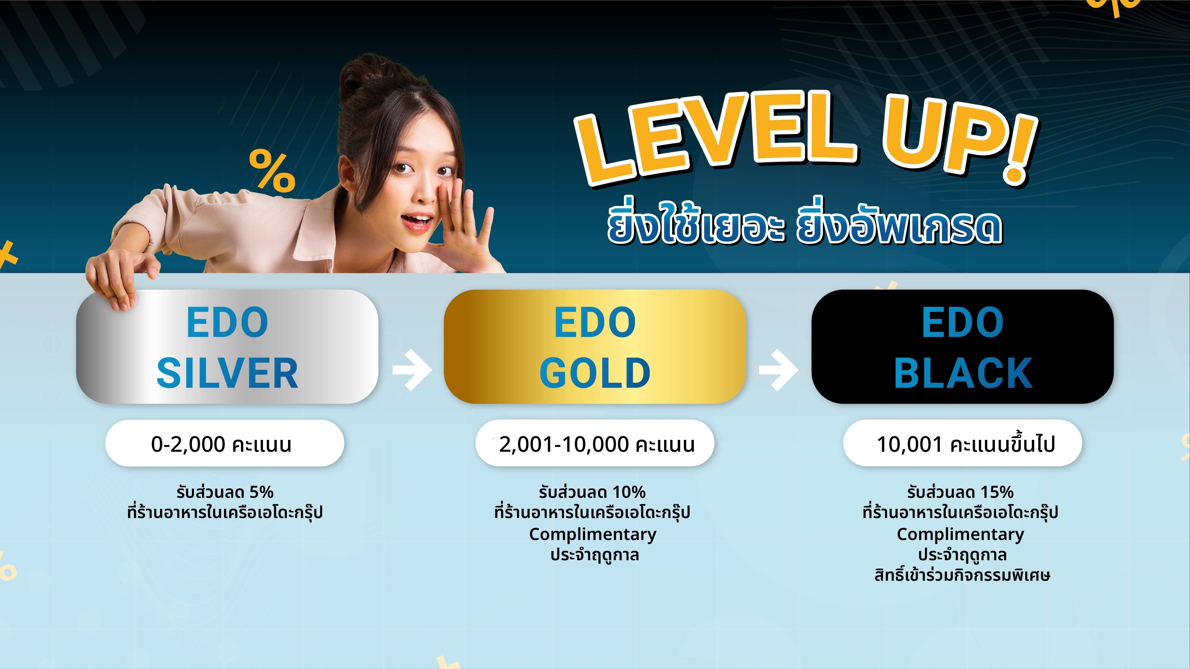 สะสมคะแนนง่าย ๆ ทุกครั้งที่ใช้จ่ายในเครือเอโดะกรุ๊ป เพียงแจ้งหมายเลขโทรศัพท์ ก็สามารถสะสมแต้มเพื่อนำไปแลกรับสิทธิพิเศษ ส่วนลด หรือของรางวัลได้ทันที